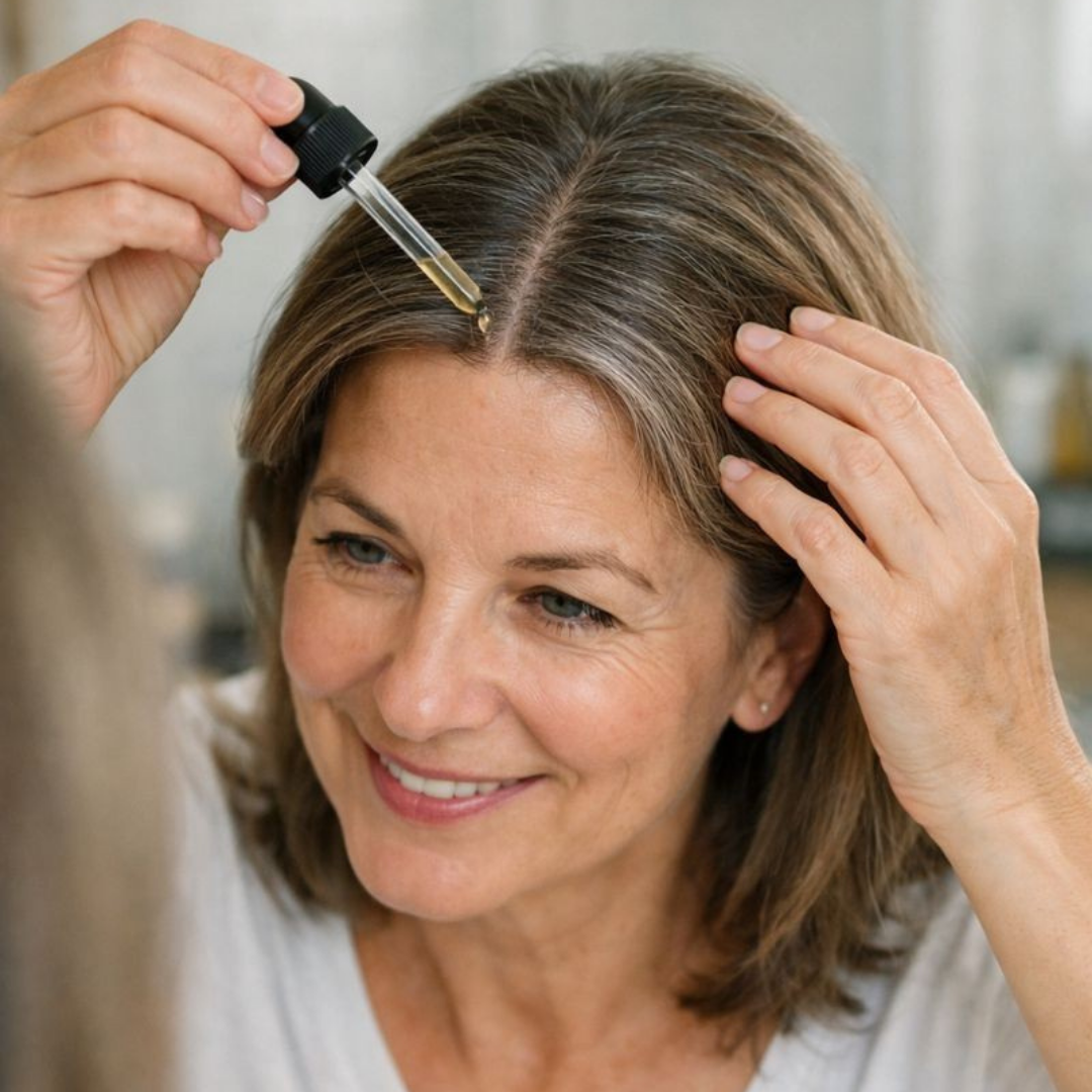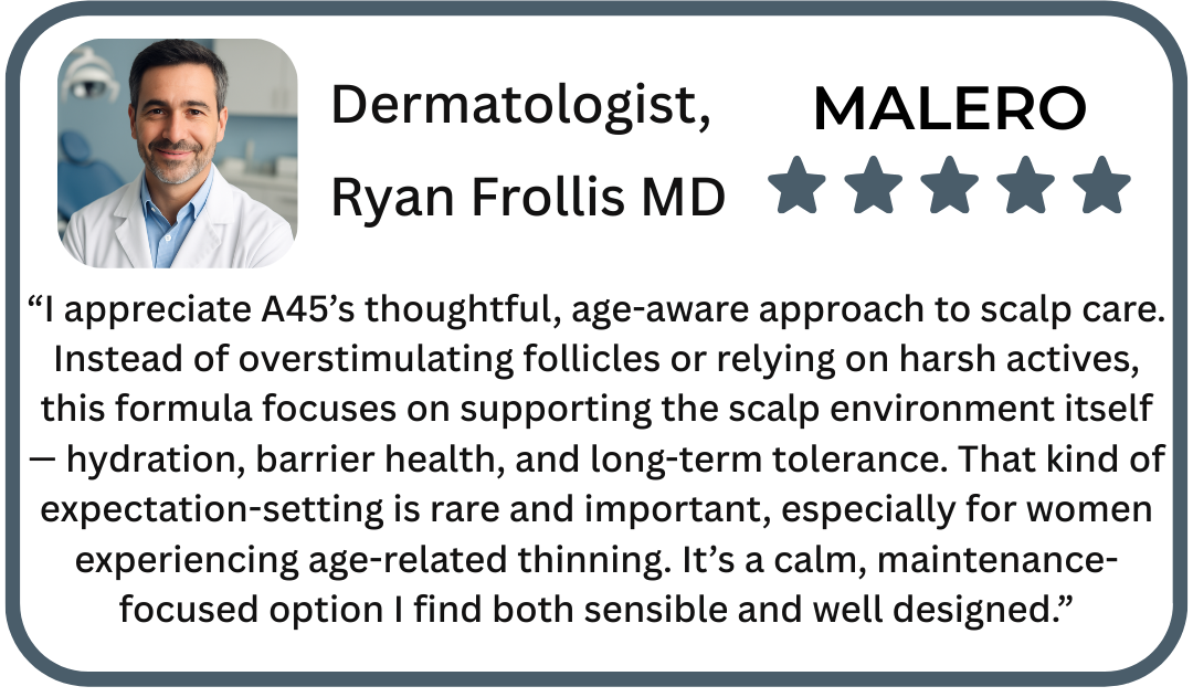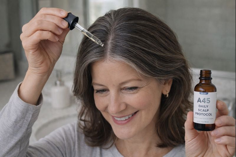 Most oils focus on coating the hair or stimulating growth. A45 is formulated specifically for the aging scalp, using a lightweight, vitamin-supported lipid system that supports the scalp barrier and follicle environment without heaviness or irritation.